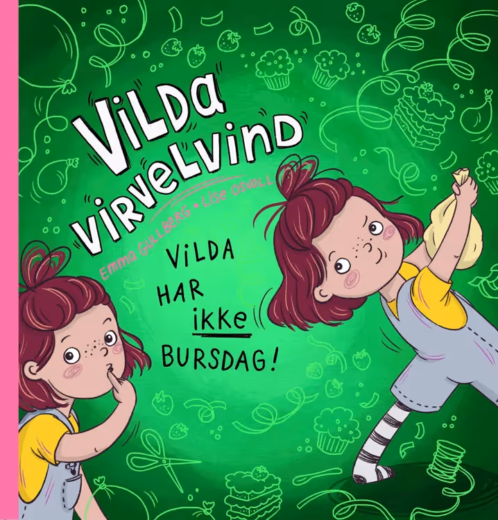 Fetter Vetle har bursdag, og det synes Vilda er blodig urettferdig. Hun vil også ha bursdag på sommeren med hagefest og uteleker. Og fortjener ikke egentlig hun også en gave? Før hun vet ord av det, har hun spist opp hele gaven til Vetle. Å nei, hva skal hun gi ham nå? Ny bok om Vilda Virvelvind, en eventyrlysten og egenrådig jente som gjør ting på sin egen måte.